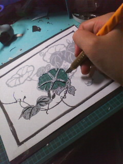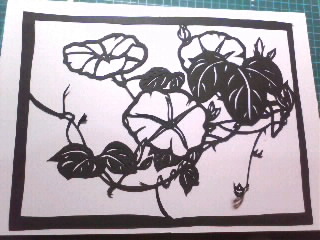 色々、趣味を発掘しよう週間♪ 前回は羊毛フェルティングでチクチク刺してましたが、今回は初めて切り絵にチャレンジ☆ 下絵はネットでフリーの図案をお借りしました。 夏っぽくアサガオです。 図案の下に黒の画用紙を重ねて、ひたすら切っていきます。 切り終わり せっかくなので、ポイントに色付きの画用紙を貼って強調させてみたりして… 完成 全部で3時間30分ほどで出来ました♪ ん~初めてにしてはなかなかじゃなイカ 今度は図案から作ってみるのも楽しそうですね~